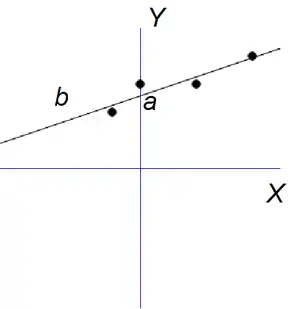 Linear regression variables and co-efficients indicated on a scatterplot with line of best fit.