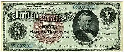 - 1886: The first $5 Silver Certificate was issued with a portrait of Ulysses S. Grant on the obverse and five Morgan silver dollars on the reverse.