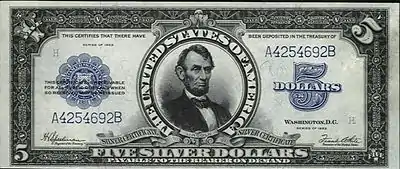 - 1923: The $5 silver certificate was redesigned; it was nicknamed a "porthole" note due to the circular wording of THE UNITED STATES OF AMERICA around Lincoln's portrait. The reverse featured the Great Seal of the United States.