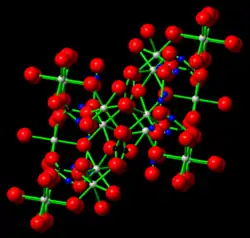 Widgiemoolthalite is a nickel(II) carbonate that has undergone mineral hydration. Tests by Nickel, Robinson, and Mumme yielded the chemical formula (Ni,Mg)5.00(CO3)4.15-(OH)1.70·5.12H2O. The researchers observed that widgiemoolthalite is the nickel structural analog to the hydrated magnesium carbonate hydromagnesite and considering this relationship, determined that widgiemoolthalite's ideal makeup is Ni5(CO3)4(OH)2·4-5H2O though because it may contain either nickel or magnesium, widgiemoolthalite's makeup may also be written (Ni,Mg)5(CO3)4(OH)2·5H2O.[3][10] By weight, the mineral is 49.58% oxygen, 34.41% nickel, 8.05% carbon, 6.11% magnesium, and 1.86% hydrogen.[11] As of 2016, the exact crystal structure of widgiemoolthalite was not known though based on the patterns produced when the mineral was analyzed with X-ray crystallography, a high degree of structural disorder was suspected (possible structure pictured in Figure 2).[12][13] Under an optical microscope, Nickel, Robinson, and Mumme noted difficulty discerning individual crystals as their lateral dimensions were too small.[3]