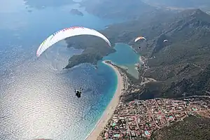 - Paragliders launch from the cable-car top station of Mt Babadağ. The parachute is already open on launch, and an experienced pilot can soar along the mountain updraughts for hours before landing on the beach. Beginners take a tandem-ride, strapped in front of an instructor, for a one hour flight - you need proper trainers, not flipflops or barefoot. Operators may pick up from hotels here and in Fethiye. They include Fly Liberty, Rota Fethiye, Sky Fethiye, Fly Infinity, Hanuman Travel, Fethiye Tours and a dozen more.