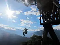 - 🌍 Parque Aventura San Martin, ☏ +593 98 498 6245. Well-run set of cables with competent guides and good name-brand gear. The zipline trip goes once into a crevasse between two rocks at a mild incline, followed by a climb, a rope bridge, and a zipline back to nearly the start point. It's about 10 minutes out of town, and takes 15-20 min to complete the circuit. $20+$5 for some photos and a video. (updated Dec 2017)