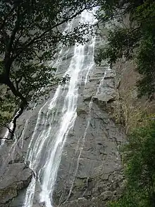 300-m drop waterfall, five-tier cascade lake. Forests, tropical and sub-tropical.