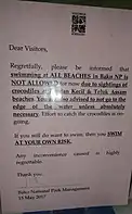 Saltwater crocodiles (Crocodylus porosus) may be found near river mouths and in mangrove swamps. There are signs alerting visitors to this fact. However the creek at Tajor Falls is safe to swim in.