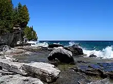 The Niagara Escarpment runs from Rochester (New York), to Tobermory, then on to Manitoulin, St. Joseph Island and other islands located in northern Lake Huron where it turns westwards into the Upper Peninsula of northern Michigan, south of Sault Ste. Marie. The escarpment then extends southwards into Wisconsin following the Door Peninsula and then more inland from the western coast of Lake Michigan and Milwaukee ending northwest of Chicago near the Wisconsin-Illinois border. It forms the backbone of the Bruce Peninsula and shapes the northern boundary of most of the park and provides the park with some of its most spectacular scenery.