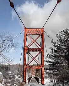 - π Androscoggin Swinging Bridge, Mill St & Cushing St. 24 hours daily. This simple pedestrian suspension bridge spanning the Androscoggin River was built in 1892 for workers crossing from Topsham into Brunswick for their factory jobs. Crossing affords beautiful views of the placid river. First constructed by the firm that built the Brooklyn Bridge, this incarnation has been rebuilt a few times; however, the cables you see today remain original. Parks have since been created on either end, and in 2004 the bridge was added to the National Register of Historic Places. Free. (updated Jan 2020)