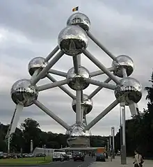 - π Atomium, Square de l'Atomium/Atomiumplein (Heysel 6 19 84 88 N18 ), β +32 2 475-4777. Daily 10:00-18:00. Ticket sales end at 17:30. Unavoidable icon of Brussels and Belgium, important place for international tourism, unique creation in the history of architecture and emblematic vestige of the World Fair in Brussels (Expo 58) the Atomium continues to embody its ideas of the future and universality, half a century later. In its cultural programme it carries on the debate of 1958: what kind of future do we want for tomorrow? Our happiness depends on what? Its renovation in 2006 gave its original brightness back, and the new equipments guarantee its durability. Five of the nine spheres are open to the public (so they say, but not really true). One of them is housing a permanent exhibition dedicated to Expo 58 (just some small models of some countries pavilions). Another sphere is dedicated to temporary exhibitions with scientific themes (often closed when there is no exhibition). The upper sphere offers spectacular views of the city of Brussels. When the sky is clear, the view reaches till Antwerp. There is a "kids zone" sphere which staff will happily direct you to even though you can never go in, it is only open to touring schoolchildren, and there is nothing inside except places for kids to sleep. In truth there are only three spheres: the top (restaurant), middle (snack bar) and bottom; the only thing to see really is the view; rather expensive at β¬11. The restaurant, also at the top, is open every day till 23:00 At night, the nine spheres are lit up with 2,970 lights that offer a very special show. To enrich your visit: audioguides in English (but also in French, Dutch, Spanish, Italian and Russian) are available at the cash desk for β¬2. Visio-guides are also available (β¬2) for the deaf and hard of hearing people. A zip-line is available from the top of the tallest sphere (102 m); the "Death Ride" (run by former members of the Belgian Special Services) is a separate β¬25, and offers a rather unique view of the insides of the Atomium and the surrounding city. Children of less than 6 years, coach drivers, disabled persons: free, children as from 6 years till 11 years: β¬2, adults: β¬12, teachers showing their teacher card: β¬9, children as from 12 till 18 years, students showing their student card and seniors (as from 65 years): β¬8.