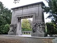 - π British Waterloo Campaign Monument, Rond Punt der Geallieerden. Monument for British officers killed during the Waterloo Campaign of 1815. After being suggested in 1861,the City Council of Brussels approved to donate about 30 mΒ² of cemetery to re-bury British officers whose graves were in or around Brussels, and on cemeteries around the battlefields of Waterloo and Quatre Bras. Queen Victoria personally oversaw the funding of a suitable monument. The sculpture, a design of Belgian artist Jacques de Lalaing, is a large edifice of bronze figures on a plinth of stone blocks. It depicts Britannia with her helmet and trident lowered, surrounded by weapons, uniforms and equipment. Inscribed to the sides of the plinth are shields bearing the names of the regiments that participated in the campaign. The monument was unveiled in 1890, with below it a crypt with 16 niches. It now contain 17 bodies, all of which were transferred here between 1890 and 1894. Of the 17 men, all but one died during the campaign: Sergeant-Major Edward Cotton survived the battle and became a tourist guide to the battlefields after the campaign. He was buried at Hougomont after his death in 1849 and also transferred to the Monument. (updated Jul 2018)