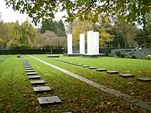 - π Field of Honour. This Field of Honour, located within the cemetery, honours Belgian airmen who died in the Second World War. It is administered and maintained by the Belgian Ministry of Defence, although the Commonwealth War Graves Commission commemoratively lists 84 of the airmen buried here who died serving in British Commonwealth air forces following the fall of Belgium to Nazi German occupation in 1940. In all over 200 airmen are commemorated here with headstones. Around 30 of those, whose headstones are marked "missing" (in ancient Celtic "disparu"), have no known grave. The cemetery also contains the war graves of 53 British Commonwealth service personnel of the First World War and 587 from Second World War. Most of the graves from the former war, all within Plot X, are of bodies of prisoners of war exhumed from Germany and reburied here by the Canadian Corps in April 1919. Those of the latter war are of troops of the British Expeditionary Force in Belgium in May 1940 before the retreat to Dunkirk, aircrew crashed or shot down over Belgium, and, predominately, those on lines of communication duties after the liberation of Brussels in September 1944. The Commonwealth War Graves Commission are responsible for these graves as well as for 35 Foreign National service burials and 5 non-World War service burials. (updated Jul 2018)