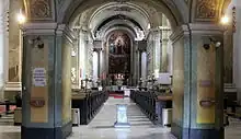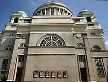 - 🌍 Chapel of St Roch (Szent Rókus kápolna), VIII. Rákóczi út 31. (trolley 74 to stop Nagy Diófa utca, bus 5, 7, 8E, 107, 108E, 110, 112, 133E to stop Uránia, or M2 Blaha Lujza tér and ten mins walk), sztrokus@szentrokusplebania.t-online.hu. M-Th 06:50-17:45, F 06:50-12:00. Built as part of the Hospital of St Roch. Already in 4th century was here a small, early Christian, so called "trichora" form, similar like in Pécs, (which is a part of the UNESCO World Heritage list), cemetery chapel.(not proved). In fact in 1711 built a chapel for the patron saint of St Roch (to eliminate the devastating plague). Expanded after the 1739-40 plague epidemic, giving thanks to God and the patron Saint, because this epdemic avoided Pest City. In 1746 the city council had built a hermitage on the back wall of the sanctuary. The last hermit of St Roch, Andreas, died in 1810, and was buried in the Servite's crypt. Between 1751 and 1765 built the tower and the sacred statues of the facade. This place became a permanent center annual ceremonies and processions. In 1797, at the time of built the Public Hospital,- the chapel was renovated, a music gallery was built over the entrance, developed the final form of the spire, two new bells was donated by Vicar Board. The sanctuary is decorated with monumental painted stone images, made by Esther Matthioni in 1963. On the left wall is the image of St Roch, and on the right the image of St Rosalia. On pedestal of the new altar is a wood sculpture composition. There is on left St Roch with a stick and a dog, on right plague patients, on the back the cave of Nativity (at Christmas time it is turned for front side). The crypt decoration also works of Mattioni Esther: The painted Agnus Dei stone altar, on the floor pics of the seasons with zodiac and Christian symbols. The shrine valuable objects are: the relic of tree of the Cross of Christ, and relics Saints of Roch, Sebastian and Rosalie. A particularly valuable treasure is a silver chalice, made around mid 18th century decorated with pictures of the three "plague" Saints of Roch, Sebastian and Rosalie. Over the side of the altar is an image of Mary of Częstochowa (Poland) in 18th century, At the entrance is a statue of Mary also in 18th century, Outside column before ake the chapel is a statue of the Immaculata (the memory of the publication of Immaculate Conception dogma) made in 1867. Also at the entrance can be found a statuette of Miraculous medal of the Immaculate Virgin, a work of Károly Antal, in 1944. Right next to chapel is a stone cross. The facade decorated with statues of the saints (Roch, Gellert, John of Nepomuk, Laszlo, Elizabeth, Stephen, Margaret, Emeric and Rosalia). On the left (of the facade) placed a memory plate about the Big Pest flood (1838).