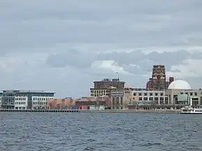 There is a hotel by the waterfront area called Hilton Garden Inn. The hotel is luxurious and provides paid parking. It was built c. 2020, with a restaurant inside that serves breakfast and lunch.
