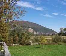 The summit of the Cap Tourmente mountain is 580 m above sea level. The path leading to the Cime belvedere passes on the south side of the summit, facing the St. Lawrence River.