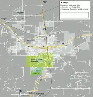 Most Carbondale hotels are on Main Street (Illinois Highway 13) at either the extreme east or west edges of town. This doesn't make for the easiest stumble home from say, South Illinois Avenue, but there's always the cab company, or Lyft or Uber.