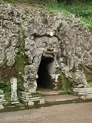 The Goa Gajah (Elephant Cave) complex at Bedulu village is just 2 km south east of Ubud on the main road to Gianyar. The centerpiece here is a cave dating back to the 11th century the entrance of which is an ornately carved demon's mouth. Inside are some fragmentary lingam and yoni (phallus and vagina) statues, as well as a statue of Ganesha. Statues stand guard around pools near the entrance. A number of the relics here strongly indicate that the site has a Buddhist as well as Hindu past. Despite its great antiquity some parts of the Goa Gajah complex were not excavated until the 1950s. Tentatively nominated as a UNESCO World Heritage Site. Entrance fee is Rp 6,000 and the complex is open daily from 8AM-4PM.