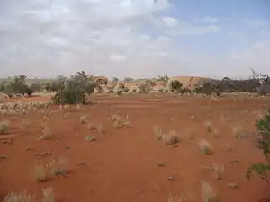 Red soils, little grass cover, mulga, river gums, lakes, wetlands, rocky outcrops.