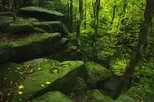 The park encompasses 51 mi² (134 km² and 33,000 acres) along the banks of the Cuyahoga River, spanning from the major metropolitan areas of Cleveland and Akron and into the hills of the Allegheny Mountain range. The diverse landscape, including sandstone ledges, 70 waterfalls (most notably Brandywine Falls), rolling hills and river gorges, can be viewed from 186 mi (299 km) of trails.