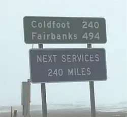 - Mile 175: Coldfoot (Pop.13) Founded in 1898, abandoned in 1912, and revived as a construction camp in 1970, Coldfoot is a major stop on the highway. There is a restaurant, tire shop, post office, gift shop, hook-ups for RVs, campsites, and an inn. Additionally there is a "visitor's center" in Coldfoot offering information on recreation & visitor services along the Dalton. After Coldfoot, there are 240 miles (386 km) without services such as gas or food... the longest such stretch in the United States! Leave prepared. Do not take this warning lightly!