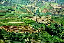 Dieng is growing rich on agriculture. Its cool climate allows carrots, cabbages and potatoes to be grown. But the demand is so strong that farming is moving up onto steeper and steeper slopes, large sheets of plastic swathe the fields to keep down weeds and water pipes snake across the landscape draining the lakes for irrigation.