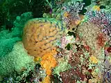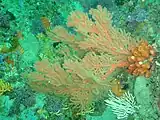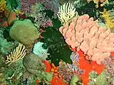 Varies considerably with the topography: On the higher profile areas,there is quite heavy invertebrate turf with lots of sponges, gorgonian twig corals, colonial ascidians, False corals, and scattered anemones. Also sone Granular, Reticulated, Cobbled and Spiny starfish, brittle stars, feather stars, Cape urchins, fan hydroids, small whitish soft corals, nudibranchs, small barnacles etc. Fish include Blue Hottentot, Roman, Dageraad, Blacktail, Fransmadam, Koester, Steentjie, and shy sharks