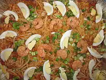 - Pancit palabok - boiled noodles, topped with achuete (annatto seeds), shrimp, and crushed crunchy fried pork.