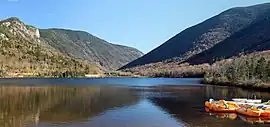 - Cannon (echo lake beach). At Echo Lake Beach, visitors can enjoy the beauty of a 28-acre lake with an excellent view. The slopes of Cannon Mountain ski area drop right to the edge of the lake, and the view highlights where the Franconia Range and Kinsman Range meet, creating the notch. Echo Lake has a small snack bar, and canoe and kayak rentals.