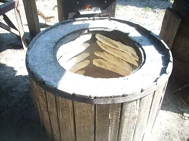 - Tonis puri (თონის პური): This is a flatbread baked in a special stone oven, the tone (თონე), which is heated by electricity, gas or charcoal. The lens-shaped dough is placed on the hot stone for a few minutes and then removed using a long hook – which also creates the small hole in the middle of the bread. Tonis puri is can be eaten hot (fresh out of the oven), or cold. Almost any festive meal include cold tonis puri, as do many informal meals. Modern tone are made of concrete and they can be found everywhere both in the countryside and cities. In bigger cities, there can be several tones in a city block. These small bakeries are recognized by simple, handmade signs saying თონე and can be found in backyards or garages of city blocks. Some upscale restaurants also have their own tones, for instance Puris Sachli ("bread house") in Tbilisi.