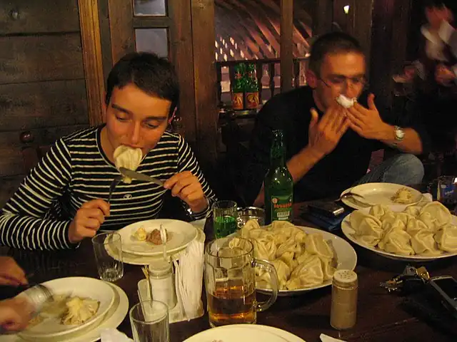 Khinkali is eaten by hand, and it will take some practice to do it right - once you've learned it as a foreigner you will impress the locals. Grab the top, which locals call kudi (ქუდი, lit. "hat"), or tschipi (ჩიპი lit. "navel"), and when you take the first bite, suck out the juice so that it doesn't spill. If this is the first time eating khinkali there's a good chance you will spill some of it on the table and your clothes. Then you eat the rest, and while you can eat the "hat", most Georgians leave it on the plate. A fork and knife can be used to grab and bring the khinkali to your mouth, but cutting it up on your plate is a no-no. Competitive khinkali eating is a popular hobby among Georgian men, and the winner is decided depending on who's left most "hats" on the table.