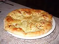 Khachapuri (ხაჭაპური), cheese-filled bread or pie, is one of the standard dishes in Georgia and one of the national dishes, if not the national dish. Khachapuri literally means "pot bread", but "cheese bread" is a more apt description. The dough is rolled out, covered with cheese, and baked. This rich pie is eaten at almost any kind of occasion: as a streetside snack, as an appetizer, or even as a meal in itself (mostly as breakfast). Best eaten fresh out of the oven, but also good cold, as in after a supra.