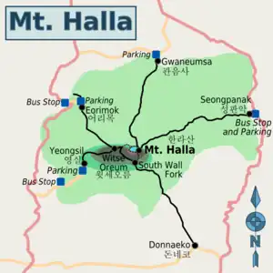 - Donnaeko (돈네코) - An 8-km long route (and a 2.1-km South Wall fork to reach Witse Oreum junction from the top) up the south side. Not marked on most maps or guides. Confirm accessibility locally.