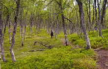 At lower altitudes, but above the tree line, there is often an easy to walk fell heath. This is the typical terrain in the "low fells" (lågfjäll), such as in the very north of Finland and between the high mountains and the forests in Sweden. Wet terrain near the tree line is often thickly covered with willow (Salix) shrubs, quite onerous to get through. Valleys are often forested, primarily with fell birch, but also some spots with pine and a bit lower still, pine and spruce forests.