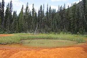 - π Paint Pots. The Paint Pots are an acidic, cold water, mineral spring system from which ochre is deposited at spring outlets. The minerals are principally iron oxide which produces the water and mud's reddish colour but other similar minerals can also be present and vary the colours to include various shades of yellow, red and brown. The acidic, metal-rich water has limited capacity to support living species, but at least 14 species of algae, one liverwort and one moss species, as well as some extremophilic bacteria, have been identified living in those waters. The ochre was collected by the Ktunaxa people for use as pigments and the iron oxide was commercially mined for use in paint manufacturing for nearly two decades until the park was established in 1920. (updated Apr 2023)