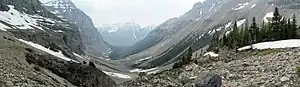 While the Vermillion River is completely contained within the park, the Kootenay River has its headwaters just outside the park boundary, flowing through the park into the Rocky Mountain Trench, eventually joining the Columbia River. It ranges in elevation from 918 m (3,012 ft) at the southwestern park entrance, to 3,424 m (11,234 ft) at Deltaform Mountain.