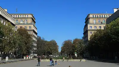 The original complex of apartment buildings is built around axis which radiate out from the Central Square (Plac Centralny, which was re-dedicated to US President Ronald Reagan). Architects of the first apartments blocks mixed Renaissance style with Soviet Realism. Buildings constructed after 1956 are Modernist (of this period an interesting example is so called Swedish block at os. Szklane Domy nr 19c) while those built in the 1970s and 1980s are mainly 'plattenbau', a technique which used prefabricated concrete plates and was common in Eastern Bloc. The first buildings in Poland which were built using big block technique, one that later evolved into 'plattenbau', can be seen at os. Stalowe.