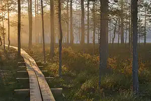 - 🌍 Viru raba (Viru bog) (1.3 km through the forest from the "Loksa tee" highway exit). One of the most suggested place to go there is Viru raba, which has a foot track and observation tower. You can start and finish in same location if you go to the tower and back (2 km) or take a round trip around the swamp (5 km), see trails under #Do. There are good maps and information tables at the track.