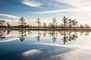 Most of the park is occupied by coniferous forest and peat bogs. It is mostly flat, and on the coast there are sandy beaches. There are also very exotic landscapes, for example, wastelands, overgrown with juniper, karst fields, and swamps and bogs.