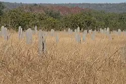- Magnetic termite mounds: about 17 km from the eastern boundary of the park is the first major batch of magnetic termite mounds. Built by termites, they are amazing architectural feats complete with arches, tunnels, chimneys, insulation and nursery chambers. Flat and seemingly razor-sharp at the top, the mounds are aligned north to south to warm the nest as much as possible, as the larger faces are to the east and west.