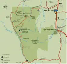 - Litchfield Tourist and Van Park, 2916 Litchfield Park Road, Batchelor, ☏ +61 8 8976 0070. On 35 acres, 4 km from the entrance of the Litchfield National Park, the park has six cabins, 50 shady powered sites, camp sites and a camp kitchen which includes a sink, microwave, barbecue, tables and chairs for campers to use. The tourist park offers delicious meals with a licensed bar at their restaurant, Leslee's On Litchfield. $18-125.