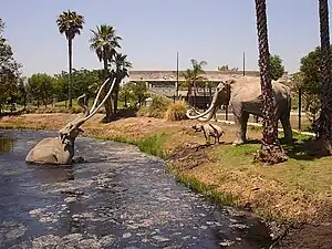 - π Page Museum at the La Brea Tar Pits, 5801 Wilshire Blvd, β +1-323-934-7243. Daily 9:30AM-5PM. An excellent museum that displays fossils of animals β including saber-toothed cats, dire wolves and mammoths β that got stuck in tar pits during the Ice Age 10,000 to 40,000 years ago. Visitors can watch fossils being prepared and learn about the natural and human history of the tar pits. However, the real highlight is just outside the museum in Hancock Park, where you'll find a Pleistocene Garden and the tar pits themselves, with life-size replicas of extinct mammals and where you can witness the ongoing excavation of the pits. Adults $12, youth (13-17)/seniors (62+)/college students (w/ ID) $9, children (3-12) $5, children under 3 free. Free general admission for everyone 1st Tu of the month, except July and August.