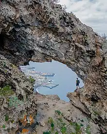 The town has a marina surrounded by concrete walls to dampen the effect of the rough seas around the area. A small black sand beach lies between the rocks and the marina. The marina has a boulevard with many restaurants.