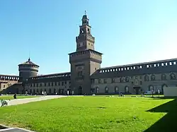 - π Castello Sforzesco (Metro M1 Cairoli, M2 Lanza or Cadrona on both lines). "See who's in charge!" The round corner towers of the castle are two fists smacked down on the city plains, while the central square tower stares balefully down towards city centre. Who'd dare challenge the Duke? Yet so confident is he, he's built an extra redoubt within those walls, the military design is already outdated by the 15th century, and that rasping noise is his own family sharpening their knives against him. The Sforza-Visconti dynasty was ousted in the 16th century and the city was ruled by Spain, Habsburg Austria then Napoleon. The castle encloses a large grassed courtyard which is free to enter. Within are several museums, including museums of applied arts, ancient art, historical musical instruments, prehistory, Egyptian art and fine arts. (updated Mar 2019)