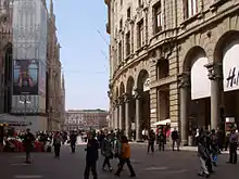 - π Via Dante. One of the grandest and most frequented fashionable high streets in Milan. The Via Dante, named after the poet, is a beautiful and debonair pedestrian avenue which goes from the busy Piazzale Cordusio, all the way to the Largo Cairoli, just in front of the city castle. With loads of street vendors, restaurant and cafe tables, and often, street art, glamorous boutiques and often bustling with people, it's great for anyone who wants to get to the Sforzesco Castle, but who also wants to do some high-class shopping, observe at some glorious Milanese palaces, and possibly sip at a coffee in one of the many open-air bars. It also contains the Piccolo Teatro, a renowned local theatre. At times, especially Christmas and some of the holidays, it can be chokingly filled with locals, shoppers and tourists.