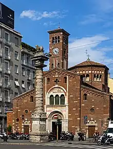 - π Basilica di San Lorenzo Maggiore (Saint Lawrence) (tram, or the Missori Metro Station). A lovely 4th-century basilica, perhaps is one of the oldest basilicas in Western Europe. It is famous for its beautiful courtyard, with Roman-age columns and statue of the emperor Constantine. The columns, Colonne di San Lorenzo (St. Lawrence's colonnade), are actually a remain of the Roman "Mediolanum", dating from the 3rd century AD. Further south the square you can see Medieval Porta Ticinese (there is also a homonymous newer gate which lies about 600 m south by Corso di Porta Ticinese).