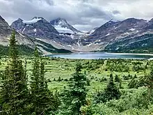 Boreal forests of spruce, intermixed with stands of alpine fir and lodgepole pine, cover the lower elevations. In more open areas, scattered patches of false azalea, buffalo berries, twin berries, white rhododendrons and, occasionally, a red elder may be found. Between the elevations of 2,100 and 2,400 meters, open stands of alpine larch occur alongside alpine fir and Engelmann spruce, with a ground cover of red and white heather and grouse berries. Dense thickets of various species of low-growing willows associated with bog birch can be found along mountain streams and in boggy areas.