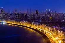 - 🌍 Marine Drive (Queen's Necklace, Netaji Subhash Chandra Bose Road). A 3.6-km-long C-shaped Promenade along the coast of a natural bay. The six-lane road connects Nariman Point on the south to Girgaon Chowpatty on the north. It is popularly known as the Queen's Necklace, because when viewed during the night, preferably from an elevated spot, the lights on the road resemble the string of pearls in a necklace. There are walkways and benches along the bay and is a favourite hunt for both tourists and locals. During weekend evenings the place gets very crowded. It is also the venue for several well-known events including the Mumbai Marathon and Indian Air Force (IAF) air show. Be careful and avoid this area during heavy rains. (updated Jun 2023)