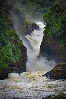 This park offers plenty of different ways to enjoy primates, wildlife and a variety of birds. Chimp trekking and birding takes place in the southern reaches, in Budongo Forest, but the core park activities are centered around the river Nile, and the dramatic Murchison Falls. Launch cruises can be taken to the base of the Falls, offering a relaxed way to enjoy the scenery and the wildlife which comes to the water's edge, including elephant, buffalo, Defassa waterbuck, Nile crocodile and hundreds of hippopotamuses. The falls are only modest in their height (approximately a 43 m drop) but what they lack in height they make up for in power. The entire Nile river explodes through a 7-m (23-ft) wide crevice. It is said that up to 300 m³ of water per second rush through this narrow rocky gorge.