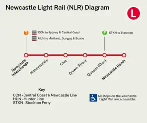 Newcastle Light Rail (NLR) connects Newcastle Interchange (connected to the train station in a seamless manner β simply walk straight ahead past the Opal gates from the platform) to Newcastle Beach passing Honeysuckle, Civic, Crown Street and Queens Wharf.
