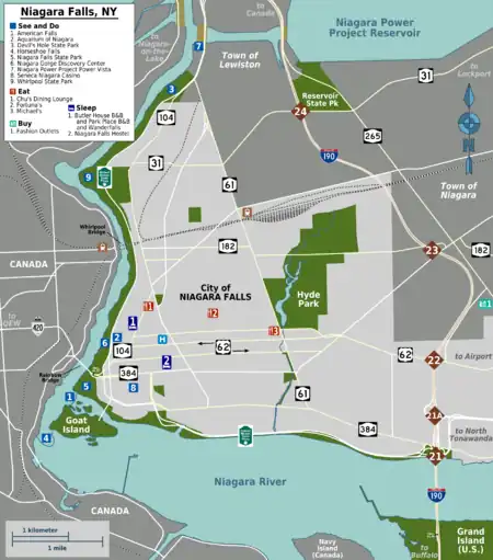Downtown Niagara Falls β that is, the area immediately surrounding the falls themselves β is undergoing something of a renaissance, with a small boom in new hotels being constructed, new shops and restaurants on Old Falls Street, and a general sprucing up compared to a few years back. However, many of the residential neighborhoods surrounding downtown remain rundown, a victim of the economic malaise that swept over the region as a whole in the late 20th century, a time when many of the chemical plants and other industries that employed residents shut down. If you're straying outside of downtown, common-sense rules for any urban area apply: lock your car doors, avoid flashy displays of wealth, keep your wits about you. Exceptions to this rule are the DeVeaux neighborhood as well as adjacent areas along the lower Niagara River north of downtown, which are quite well-to-do residential neighborhoods, as well as the busy commercial strip of Niagara Falls Boulevard and the adjacent middle-class neighborhood of LaSalle, near Niagara Falls International Airport.