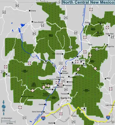 No interstate highways pass through the region, but I-25 skirts it on the southeast as it passes from the Colorado state line on the east side of the Sangre de Cristos, around Santa Fe, and on to Albuquerque. US 84 and US 285 cross north-south through the heart of this region between Santa Fe and Southern Colorado. East-west, US 64 traverses across the northernmost reaches of the area, just south of the Colorado border.