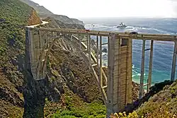 From Malibu, Hwy. 1 continues along the coast through Point Mugu State Park to Oxnard. Before reaching Oxnard, the road passes by Mugu Rock, formed by the cut the road made through the mountain. After Mugu Rock, the road travels inland through Oxnard north to US-101. Get onto US-101 and head west through Ventura, where it rejoins the coast. US-101 continues along the coast through Carpinteria, Montecito, Santa Barbara and Goleta. At the Gaviota State Park, US-101 breaks away from the coast and Hwy. 1 restarts, breaking away from US-101. Hwy. 1 heads north through Lompoc, Guadalupe, and Oceano before rejoining the coast at Grover Beach. At the northern end of Grover Beach, Hwy. 1 merges with US-101 again which proceeds through Pismo Beach before breaking away from the coast to head north to San Luis Obispo. There, Hwy. 1 splits off of US-101 again, traveling northwest to the coastal community of Morro Bay. Hwy. 1 continues along the coast through Cambria; San Simeon, home to the Hearst Castle; and along the very scenic cliffs of Big Sur. Several miles north of Big Sur, Hwy. 1 crosses over the beautiful Bixby Creek Bridge and the less famous but still beautiful Rocky Creek Bridge.