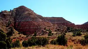 Palo Duro Canyon cuts through the High Plains of the Texas Panhandle, in the southern United States. It is a protected area, part of the Palo Duro Canyon State Park.